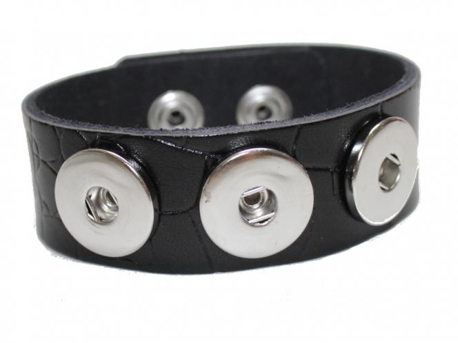 Dieses Armband aus genarbtem Leder in schwarz ist für drei Druckknöpfe konzipiert. Es ist ein neutraler Begleiter für farbstarke Klicks.