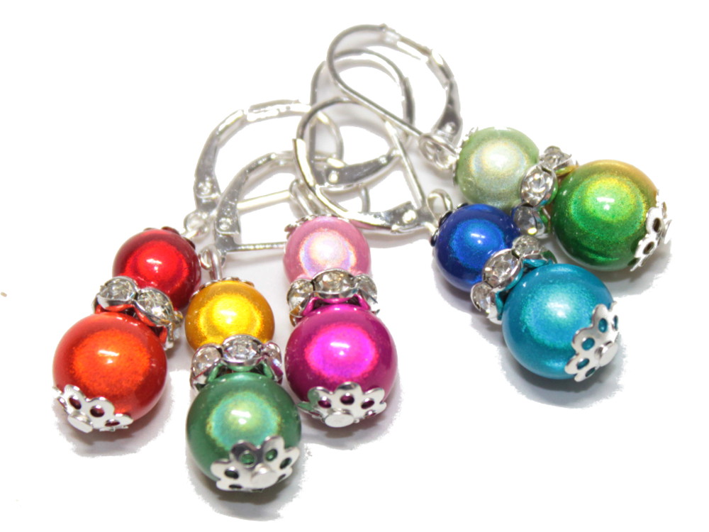 Ein Set mit fünf Maschenmarkierern aus Miracle Beads und glitzernden Strassrondellen.
