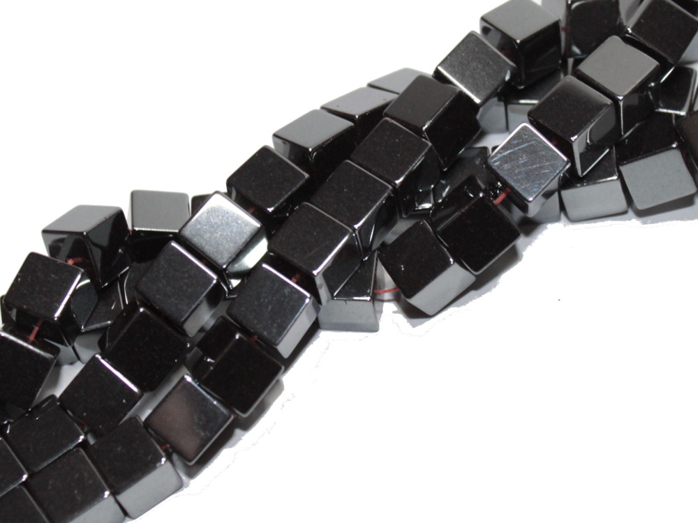 Ein Strang Hämatit Würfel, ca. 6 x 6 mm, poliert, daher metallisch glänzend.