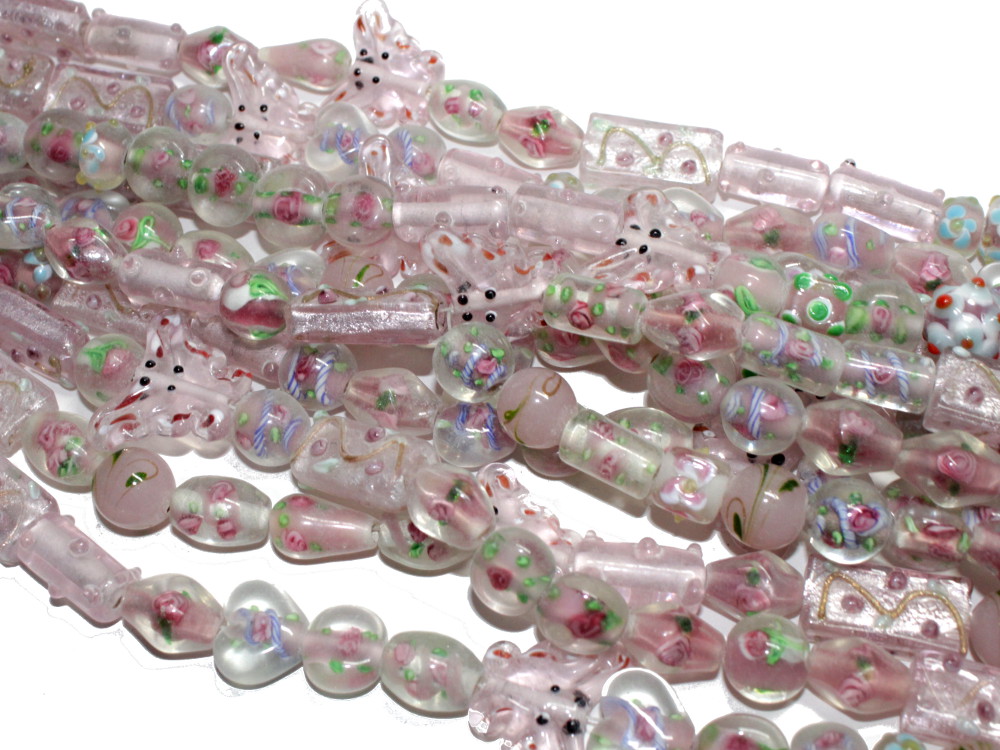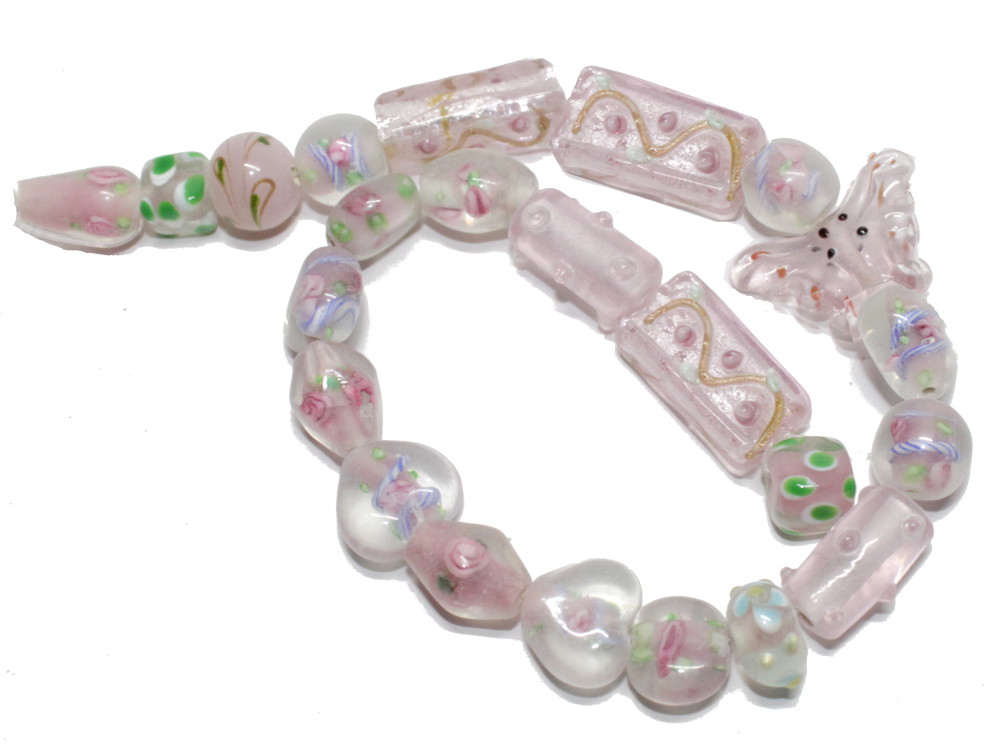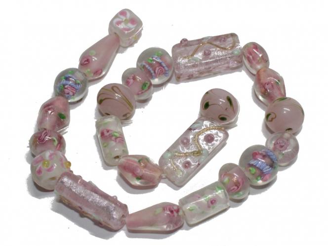 Ein Strang mit gemischten Lampwork Perlen Grundfarbe Rosa, teilweise mit Blumenmuster. Teilweise mit eingelegter Silberfolie.  Rondelle, Scheiben, Bicone, Walzen und Oliven gemischt. Perlengröße ca. 8 - 15 mm. Das Stranggewicht geträgt ca. 55 - 60 Gramm.