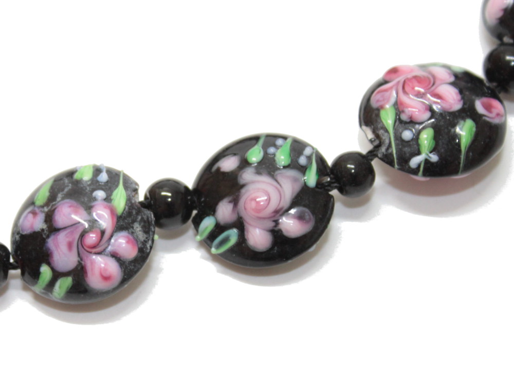 Zwei Lampworkperlen Rose auf schwarz, ca. 17~18x10~11mm, Fädelloch ca. 2 mm.
