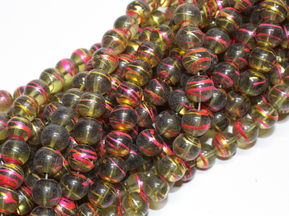 40 gelbe Glasperlen mit 10 mm Durchmesser, mit einem pink und goldfarbenem Muster.