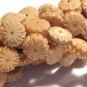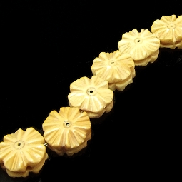 Eine Knochenperle Blume ca. 12 x 6 mm, quer durchbohrt. Sehr detailreich beidseitig geschnitztes Muster.