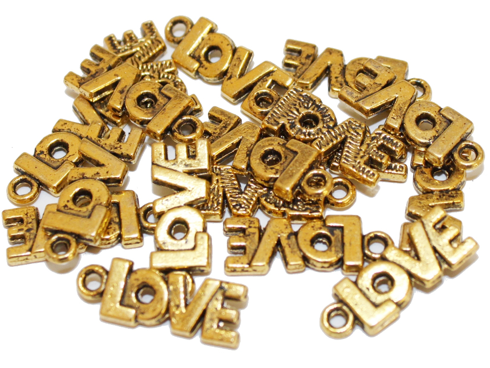 Zehn Anhänger / Charm Love Schriftzug mit Öse, ca. 21 x 8 mm, goldfarben,Tibetsilber.