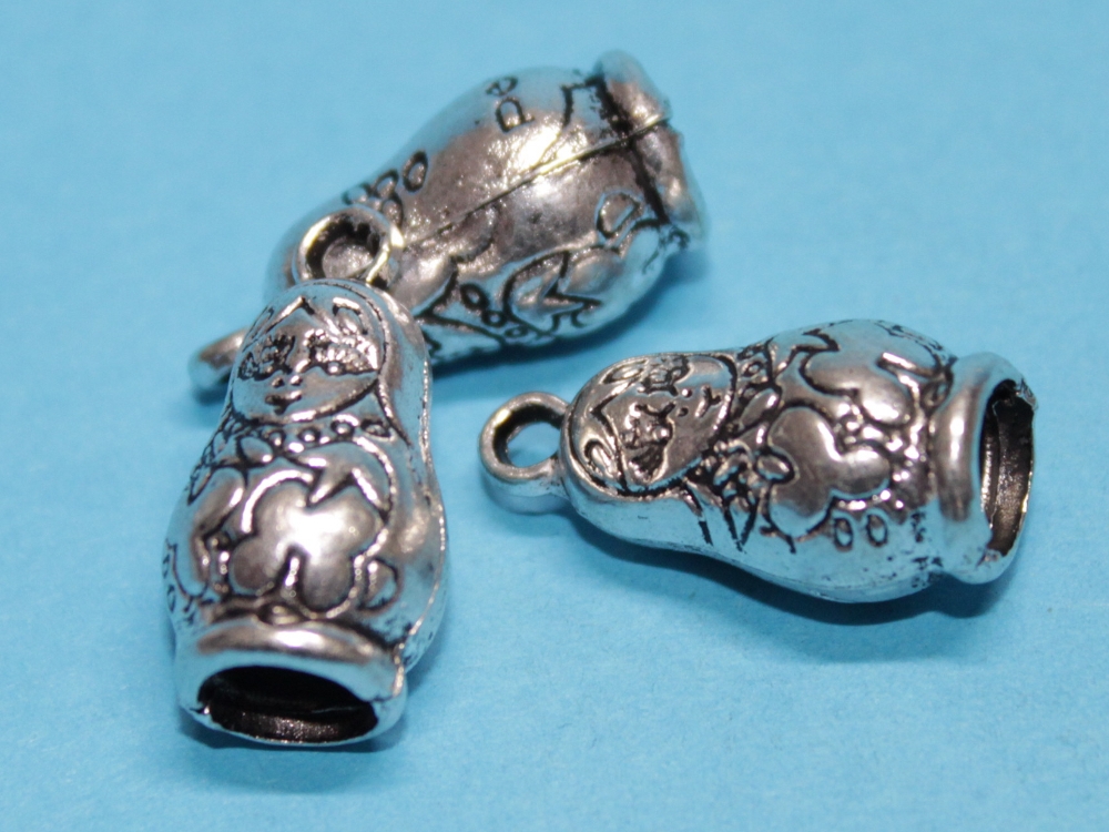 Drei Anhänger in Form einer niedlichen Matroschka. Die Anhänger sind ca. 25x12x12mm. Die Öse ca. 3mm.
