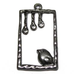 Fünf Anhänger Vogel im Rahmen, schwarz. Die Anhängerchen sind ca. 34 x 19 mm groß und schwarz. Kleine Vögelchen sitzen auf stilisierten Käfigen.