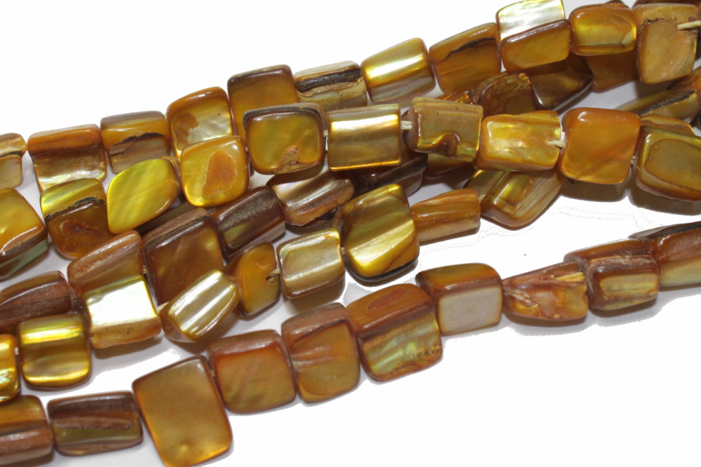 Ein Strang Muschelstäbchen, ca. 7-8 mm x 7 mm x 5-6, goldbraun gefärbt. Stranglänge ca. 39 cm, ca. 46 - 49 Stäbchen je Strang.