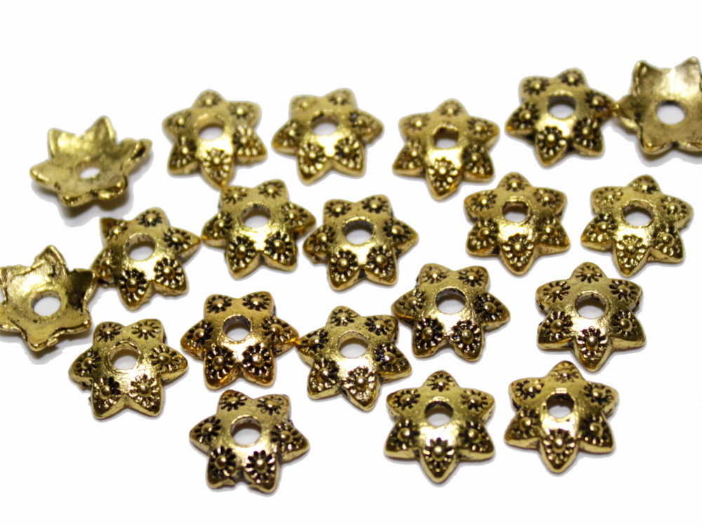 Zwanzig Perlenkappen, ca.  9 x 3 mm mit Sternchen, altgoldfarben.