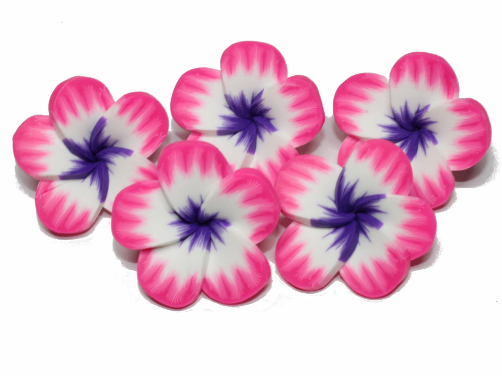 Fünf Perlen aus Polymer Clay (Fimo) in Form und Farbgebung einer Frangipaniblüte. Größe ca. 33 x 13 mm. Das Fädelloch ist ca. 1-1,5 mm groß und verläuft quer auf der Unterseite.
