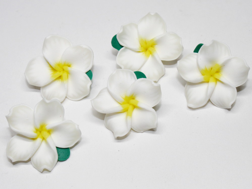 Fünf Perlen aus Polymer Clay (Fimo) in Form und Farbgebung einer Frangipaniblüte. Größe ca. 27 x 12 mm. Das Fädelloch ist ca. 1-1,5 mm groß und verläuft quer auf der Unterseite.