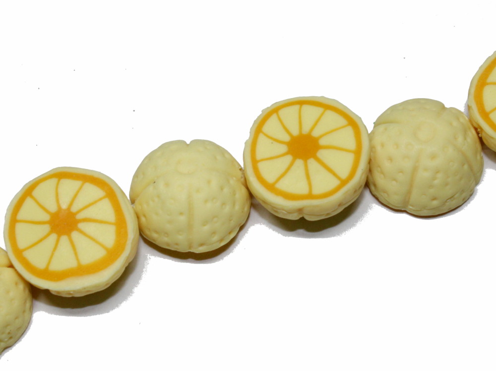 Vier Perlen aus Polymer Clay (Fimo) in Form und Farbgebung einer halbierten  Grapefruit.