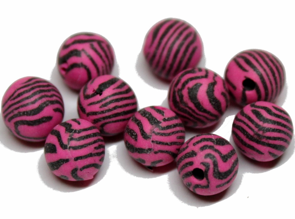 10 Perlen aus Polymer Clay (Fimo) mit Zebra-Muster in schwarz-pink. Ca. 8 mm.