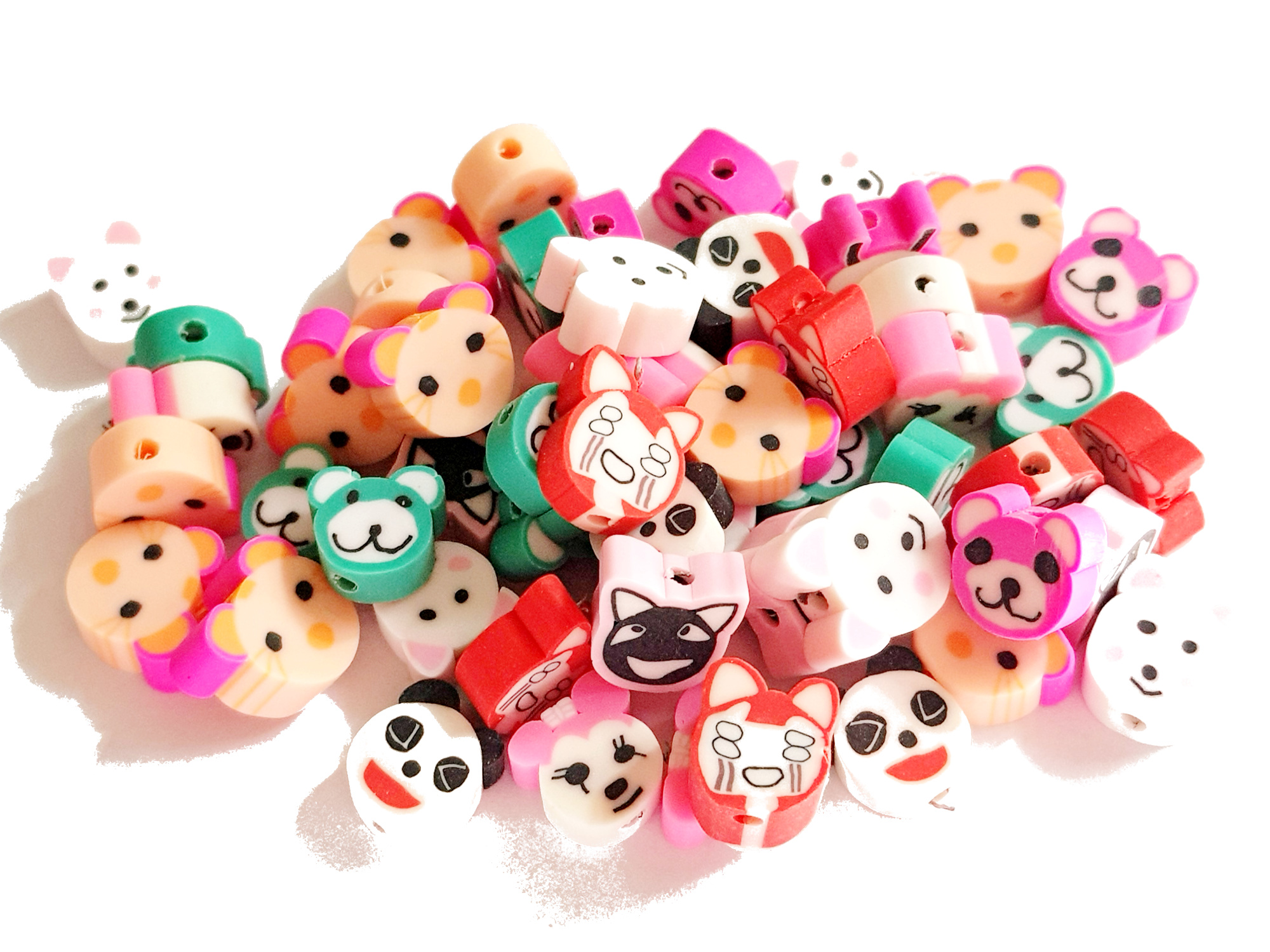 50 gemischte Perlen aus Polymer Clay (Fimo) in Form von verschiedenen Tierköpfen, ca. 9-11 x 10-11 mm, 4 - 5 mm dick. Bohrloch längs zur Spitze, ca. 1,5 -2 mm.