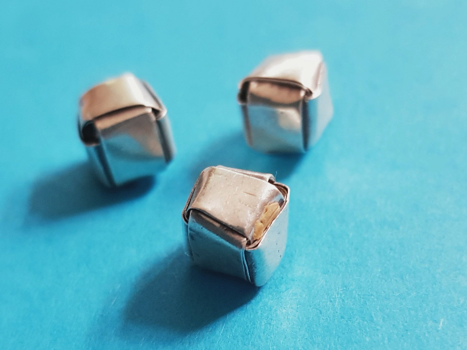 Ein Würfel, diagonal gebohrt, ca. 7 mm Kantenlänge, geflochten, 925/- Silber.