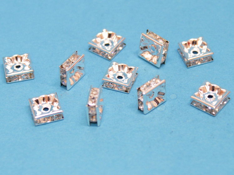 Zehn Strassquadrate ca. 8 x 8 mm. Sehr schön zwischen Würfeln, aber auch zwischen größeren Kugeln interessant.