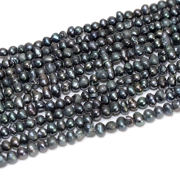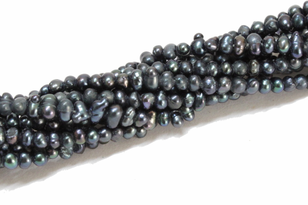 Ein Strang Süßwasserperlen, schwarz, ca. 2  mm, Potatoform, wenig Wachstumsmerkmale. Ca. 133-135 Perlchen je Strang. Stranglänge ca. 38 cm.