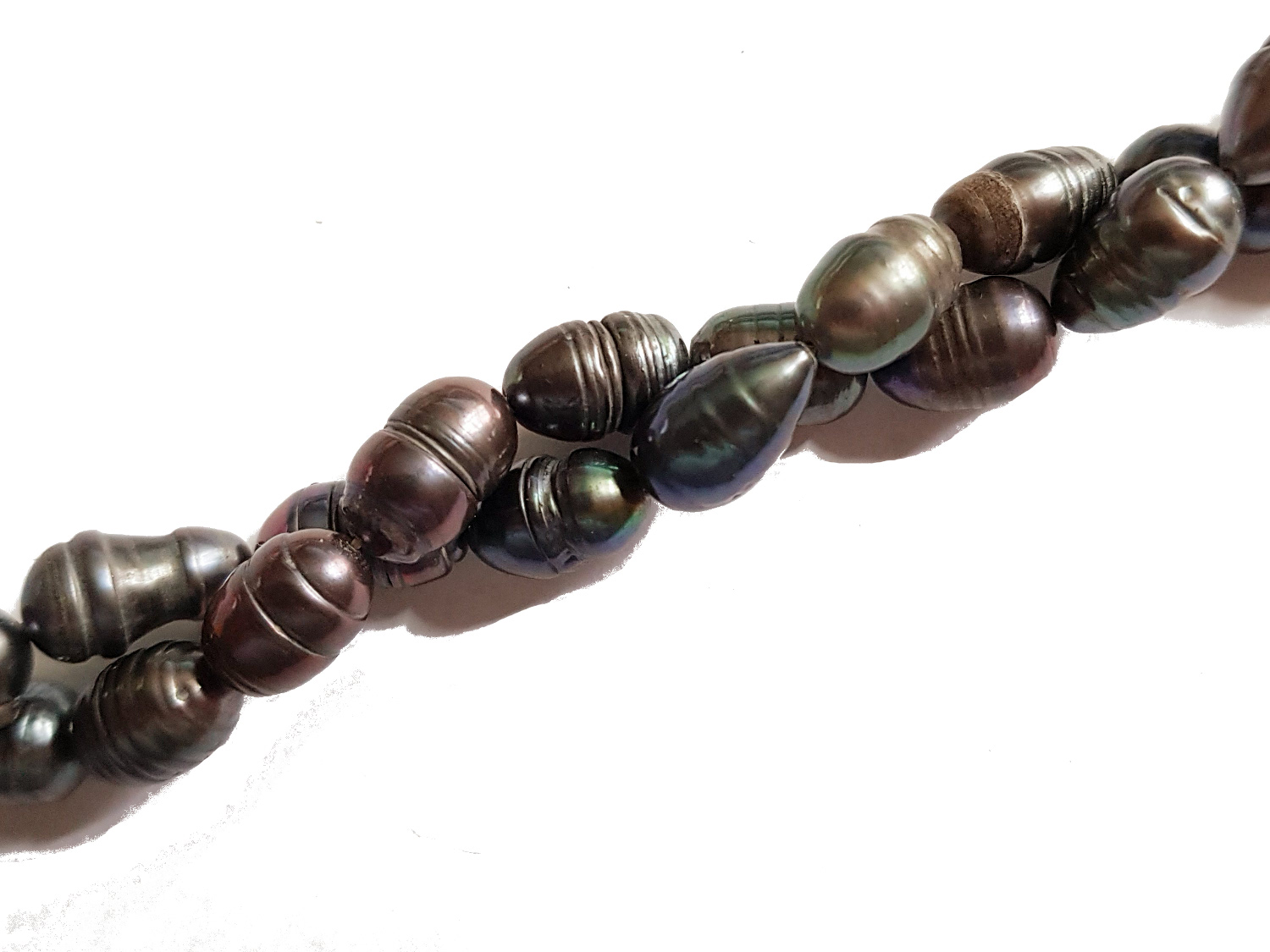 Eine Strang Süßwasserperlen, schwarz, ca. 7 x 10 mm, Reiskorn. Sehr lebhafte Perle mit vielen Wachstumsringen.