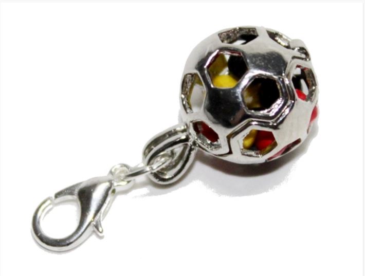 Charm mit Anhänger in Fussballform, gefüllt mit Perlen in schwarz, rot und gold. Ein süßes Accessoire für den echten Fan! ;-)