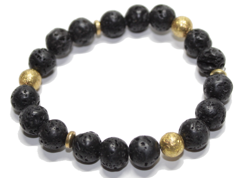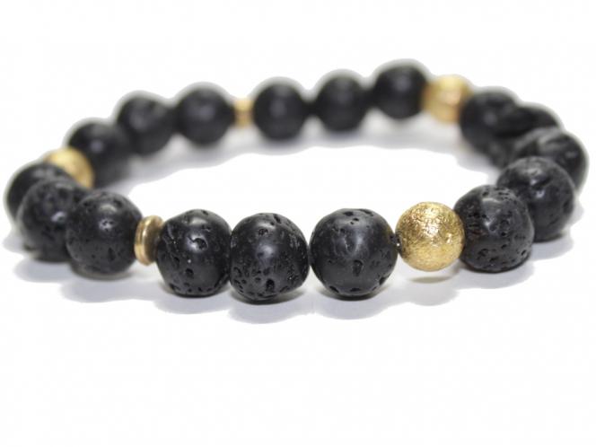 Lava-Kugeln (10 mm) und vergoldete Zwischenteile aus Silber (925/-) sind hier kombiniert: gebürstete KLugeln und polierte Rondelle lockern die Lava auf. Das Armband ist auf Silikon-Elastikband gefertigt und hat ca. 20 cm Umfang.