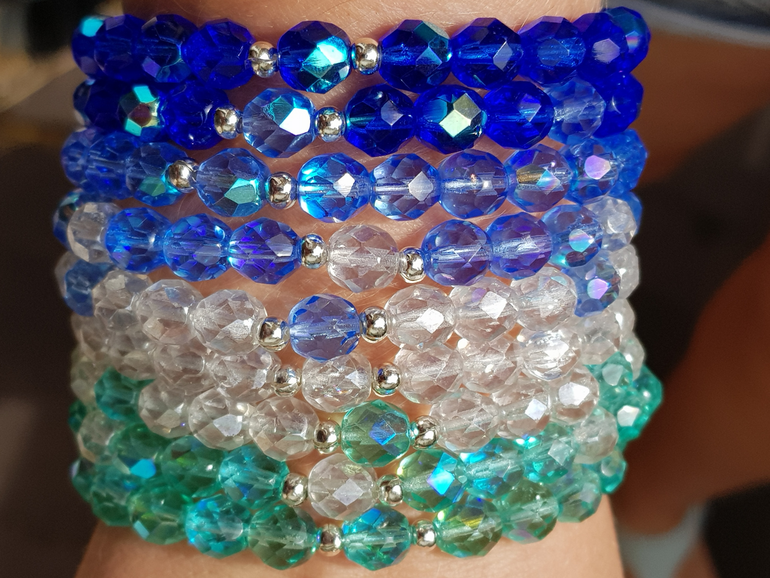 Sie sind aus 8mm Glasschliffperlen gefertigt und auf Elastikband gearbeitet. Dies passt sich ideal dem Handgelenk an. Die hier gezeigten Armbänder sind für 18 cm Gelenkumfang gearbeitet. Sie lassen sich jedoch auf Wunsch auch in der Größe anpassen.