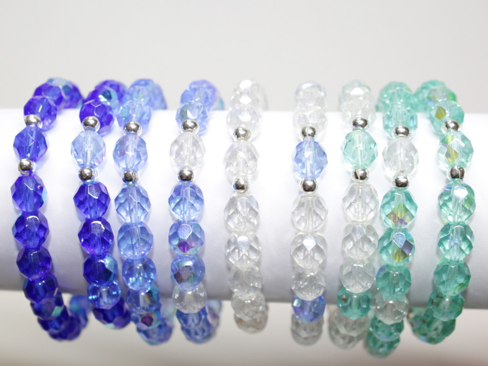 Diese zierlichen Armbänder aus böhmischen Glasschliffperlen lassen sich wunderbar miteinander kombinieren. Eine Perle wird dezent durch kleine silberfarbene Perlchen betont.