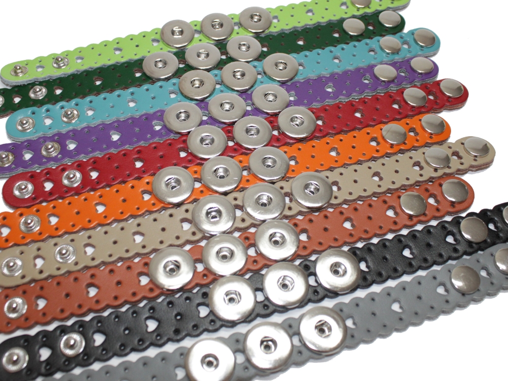 Diese hübschen Lederarmbänder gibt es in vielen Farben. Sie sind eine schöne Basis für die meisten Druckknöpfe und passen durch die große Farbpalette zu fast jedem Outfit. Sie sind für drei Klicks konzipiert.