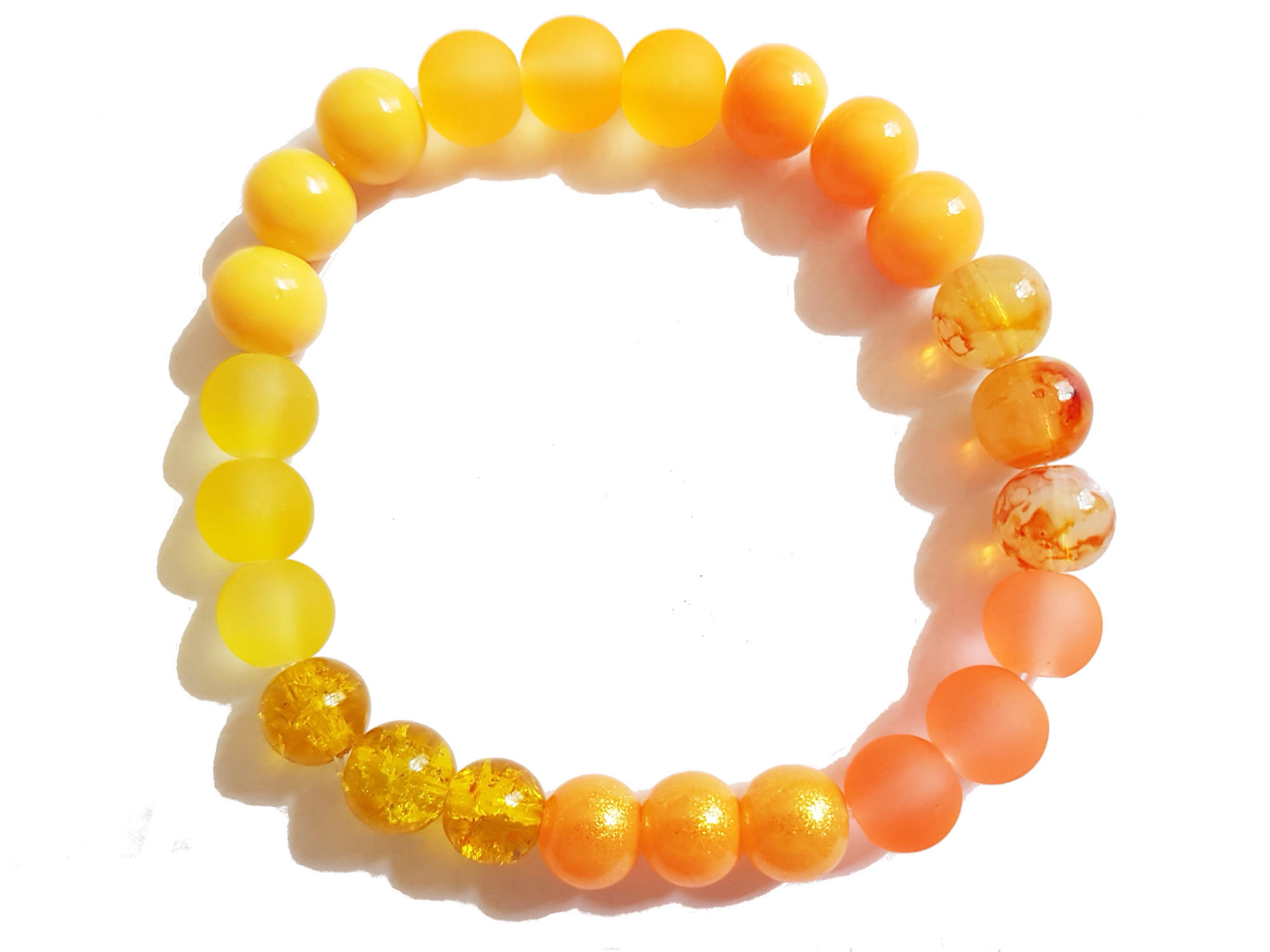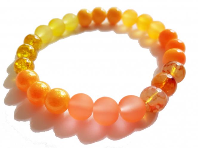 Acht unterschiedliche Glasperlen in Dreiergruppen ergänzen einander zu diesem sommerlichen Armband. Die Perlen haben einen Durchmessser von ca. 8mm.