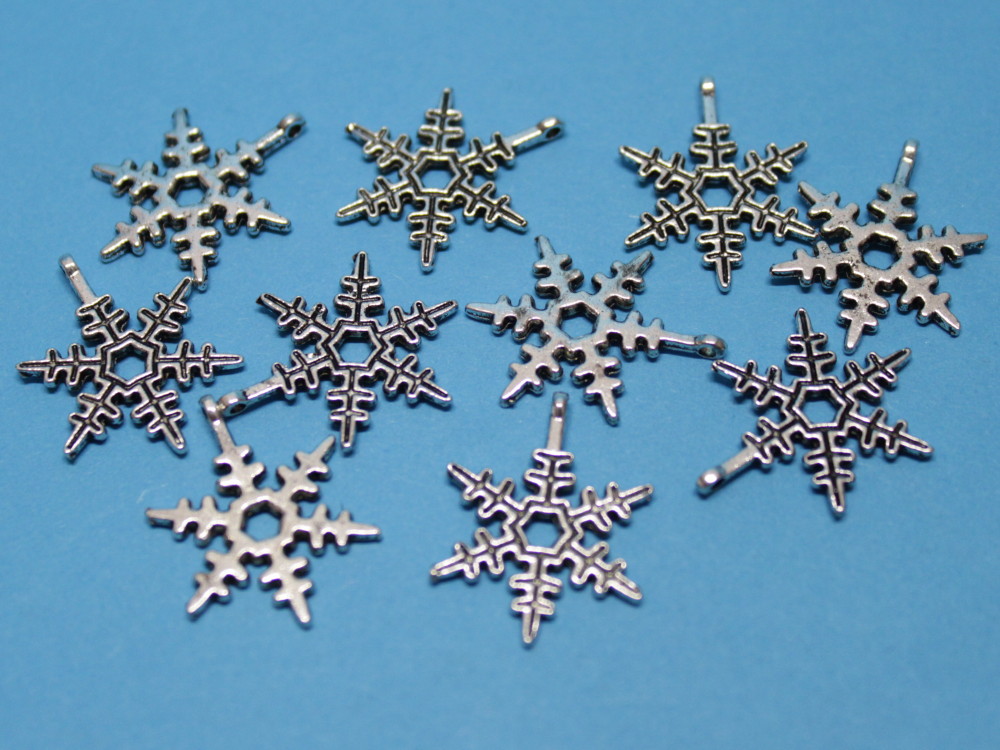 Fünf Metallanhänger Schneeflocke, ca. 23 x 18 mm mit Öse, teilweise geschwärzt.