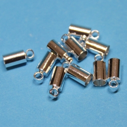 10 Endkappen für Bänder, 3 - 3,5 mm. Die Bänder werden in die Kappen eingeklebt. Dann kann an der Öse der Kappen ein Verschluss angebracht werden. Die Kappen sind mit Öse ca. 9 mm lang.