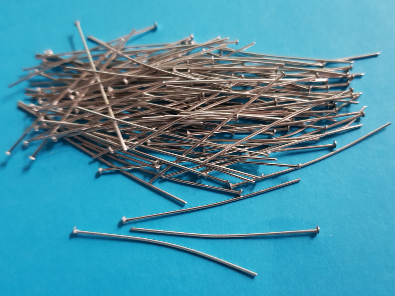 100 Nietstifte, Stahl platinfarben. Länge ca. 35 mm, ca. 0,6 mm dick, Köpfchendurchmesser ca. 2 mm.