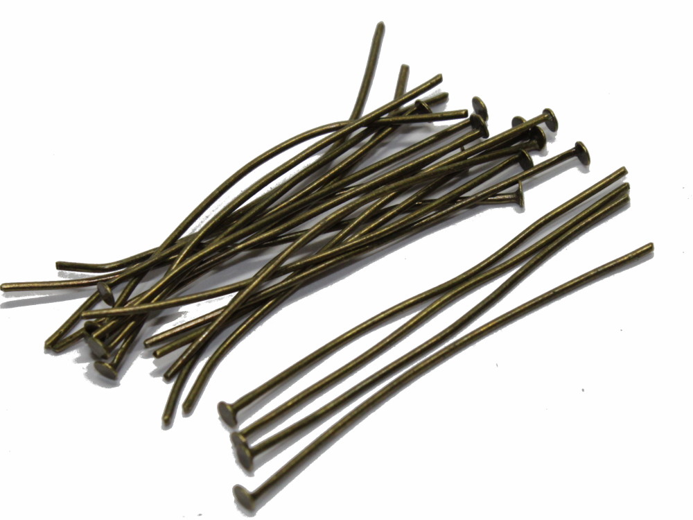 100 Nietstifte, bronze-/altgoldfarben. Länge ca. 45 mm, ca. 0,7 mm dick, Köpfchendurchmesser ca. 2 mm.