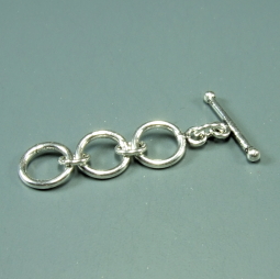 Ein Knebel-Verschluss mit 3 Ringen, kupfer versilbert, poliert. Durchmesser der Ringe je ca. 12 mm, Stablänge ca. 22 mm. Gesamtlänge des Ringteils ca. 40 mm.